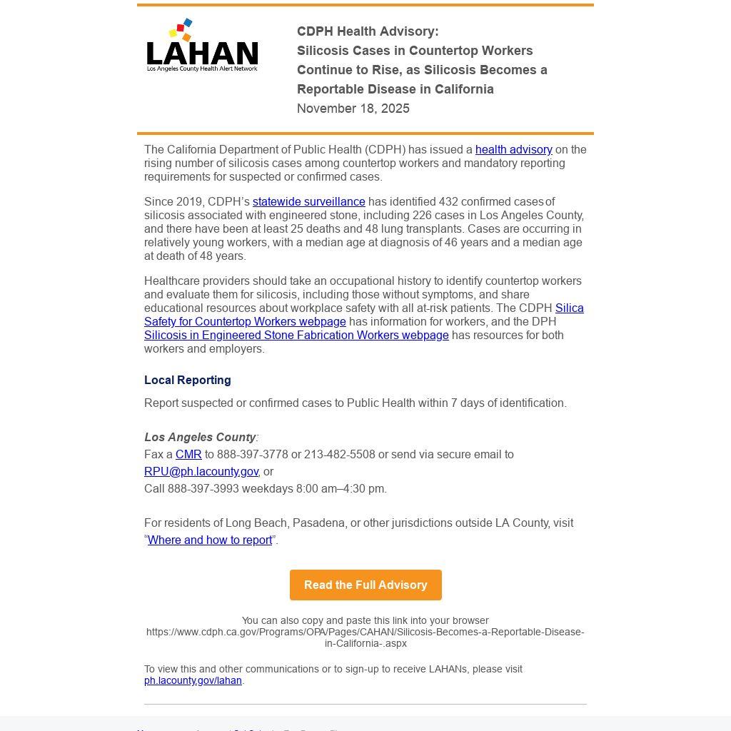 The California Department of Public Health (CDPH) has issued a health advisory on the rising number of silicosis cases among countertop workers and mandatory reporting requirements for suspected or confirmed cases.