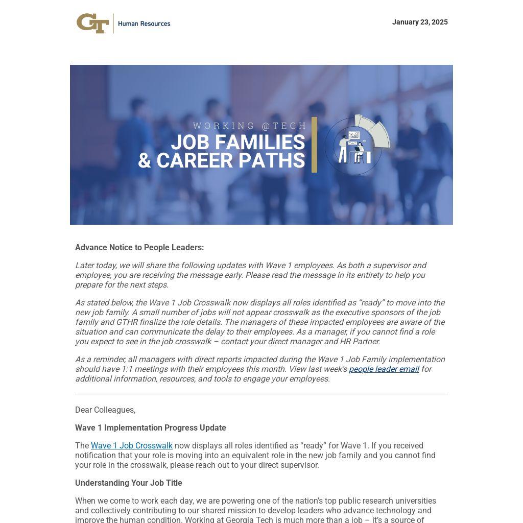 As a reminder, all managers with direct reports impacted during the Wave 1 Job Family implementation should have 1:1 meetings with their employees this month. View last week’s people leader email for additional information, resources, and tools to engage your employees.