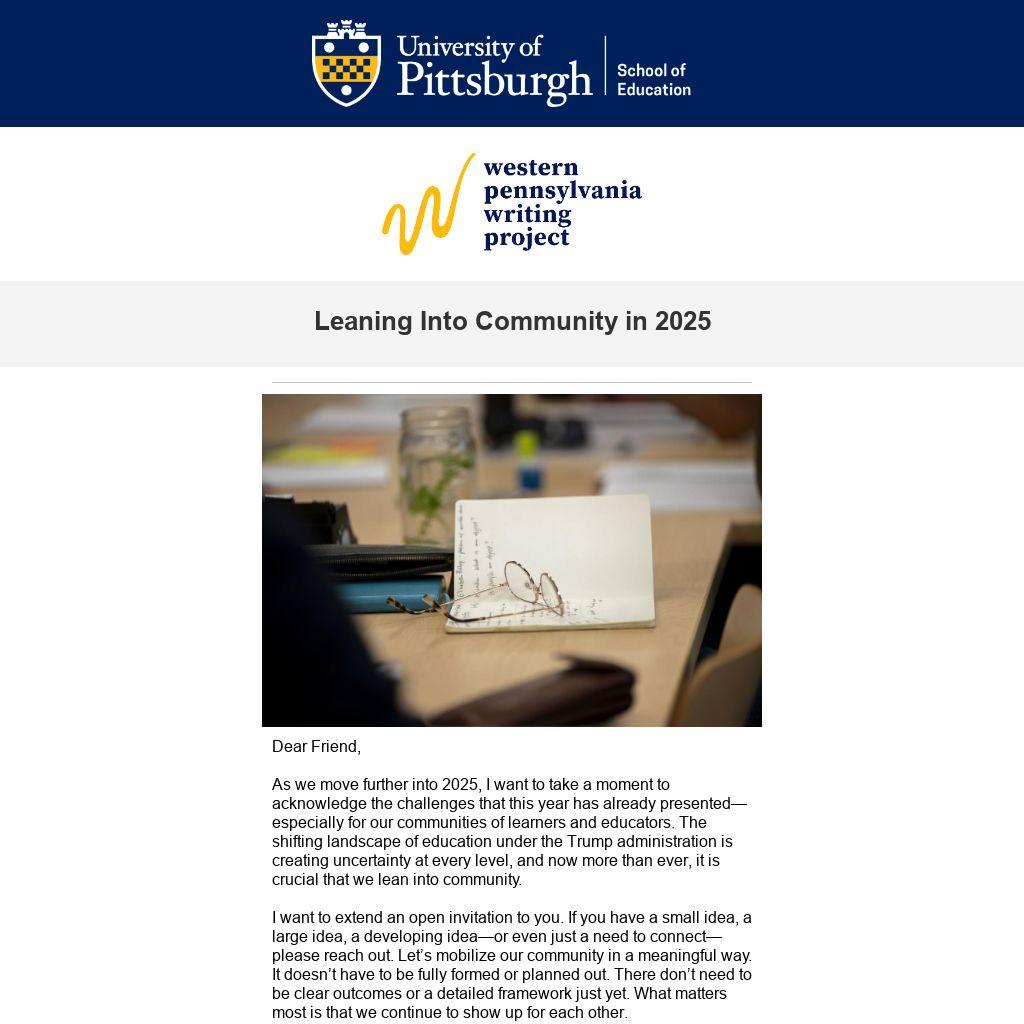 The Western Pennsylvania Writing Project has always been built on the power of community, and that remains true in this moment. Together, we will navigate the changing realities of our classrooms, institutions, and personal lives. The Writing Project is here, and we want to be here in ways that support and sustain you. Let’s open the space.