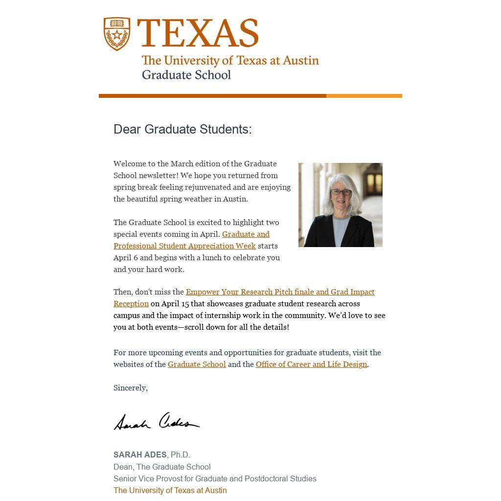 Welcome to the March edition of the Graduate School newsletter! We hope you returned from spring break feeling rejunvenated and are enjoying the beautiful spring weather in Austin.