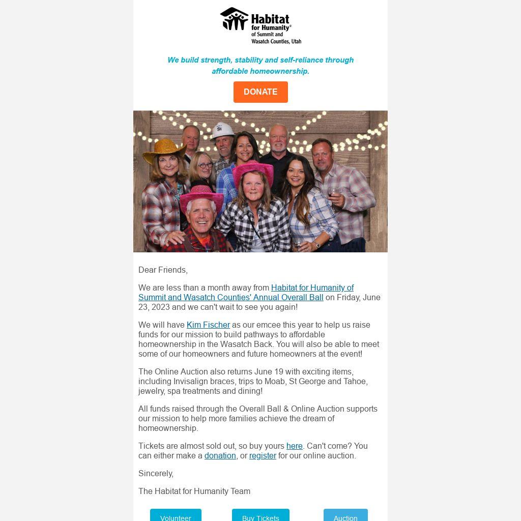 We are less than a month away from Habitat for Humanity of Summit and Wasatch Counties' Annual Overall Ball on Friday, June 23, 2023 and we can't wait to see you again!