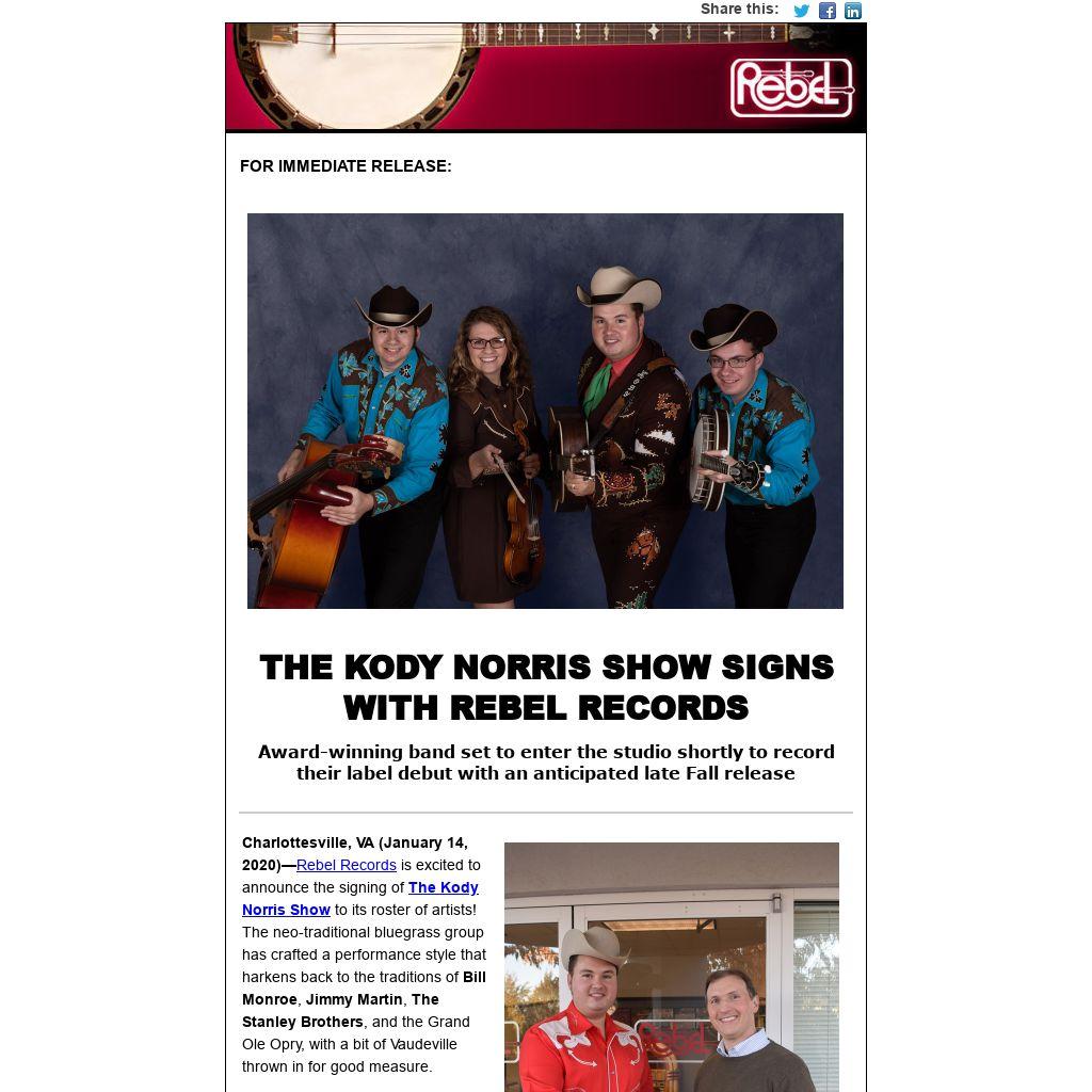 “I can’t imagine a more appropriate union than Rebel Records and this band,” Norris says. “We’re just thrilled at all of the possibilities and grateful to Mark [Freeman] and his team. These are folks who are completely devoted to the same mission as The Kody Norris Show -- sharing the tradition of bluegrass music and just plain good entertainment.”
