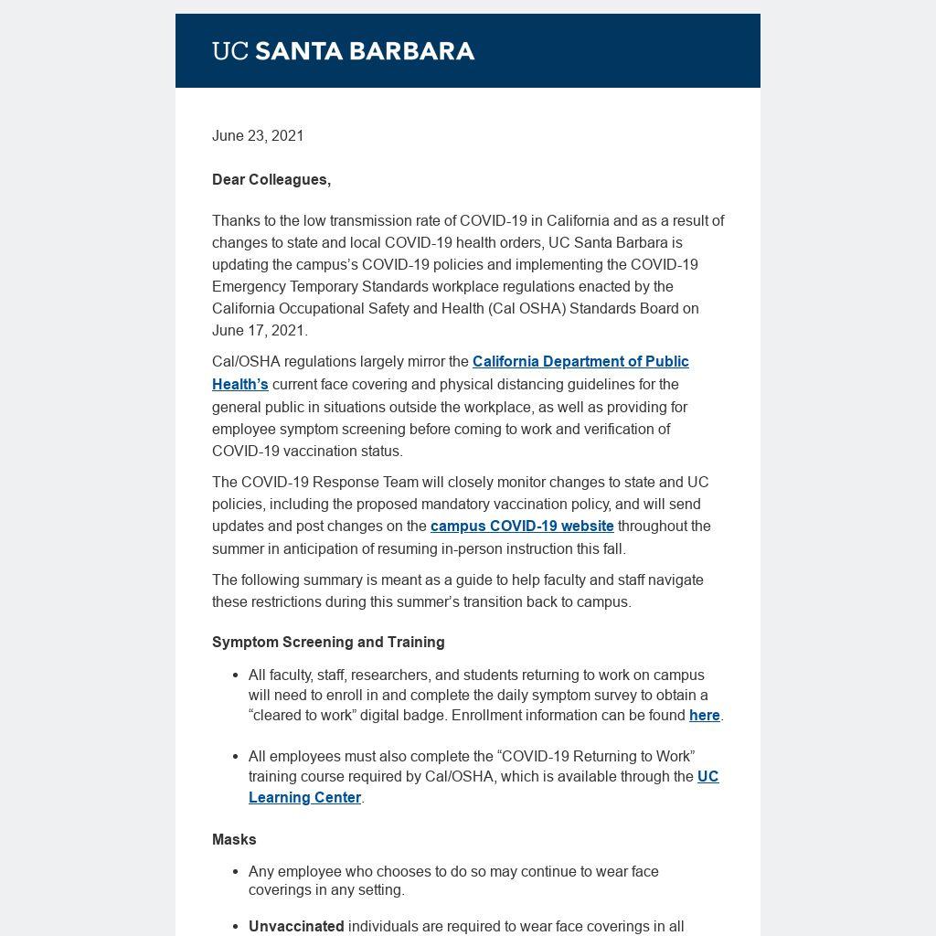 Thanks to the low transmission rate of COVID-19 in California and as a result of changes to state and local COVID-19 health orders, UC Santa Barbara is updating the campus’s COVID-19 policies and implementing the COVID-19 Emergency Temporary Standards workplace regulations enacted by the California Occupational Safety and Health (Cal OSHA) Standards Board on June 17, 2021.