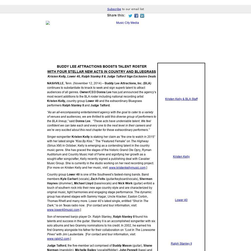 NASHVILLE, Tenn. (November 12, 2014) – Buddy Lee Attractions, Inc. (BLA) continues to substantiate its knack to seek and sign superb talent to attract audiences of all genres. Owner/CEO Donna Lee has just announced the agency’s most recent additions to the BLA roster including national recording artist