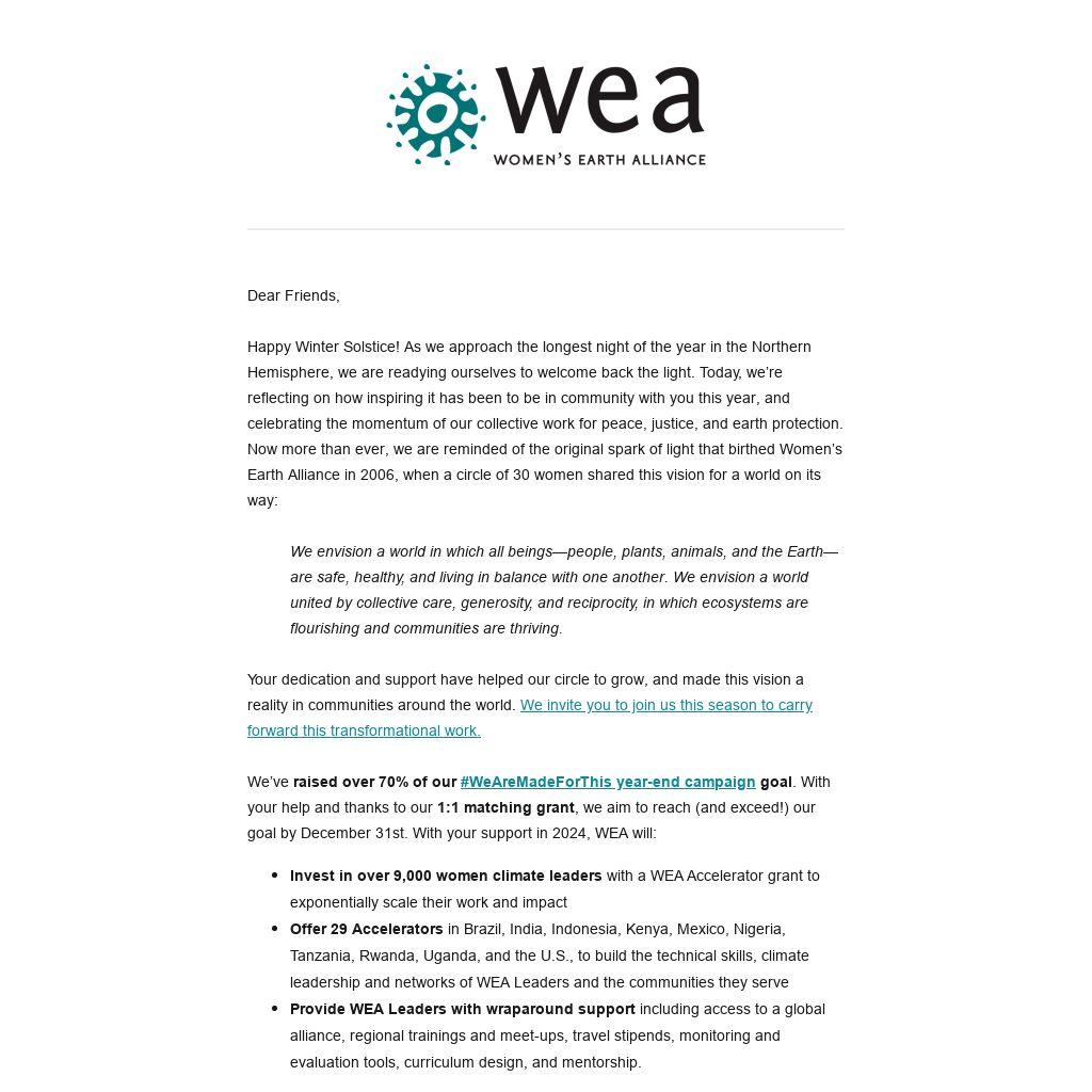 We’ve raised over 70% of our #WeAreMadeForThis year-end campaign goal. With your help and thanks to our 1:1 matching grant, we aim to reach (and exceed!) our goal by December 31st. With your support in 2024, WEA will: