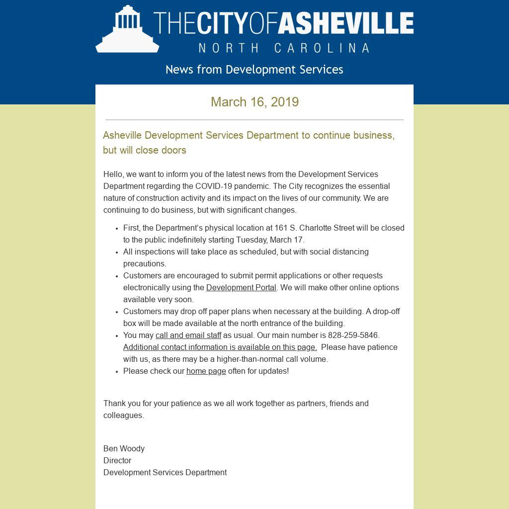 - First, the Department’s physical location at 161 S. Charlotte Street will be closed to the public indefinitely starting Tuesday, March 17.
