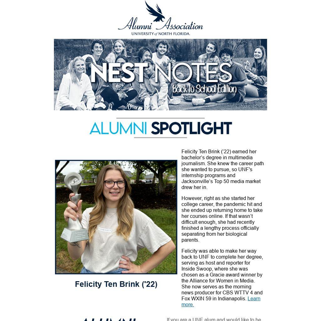| If you are a UNF alum and would like to be featured in an upcoming Alumni Spotlight, please fill out this form below.