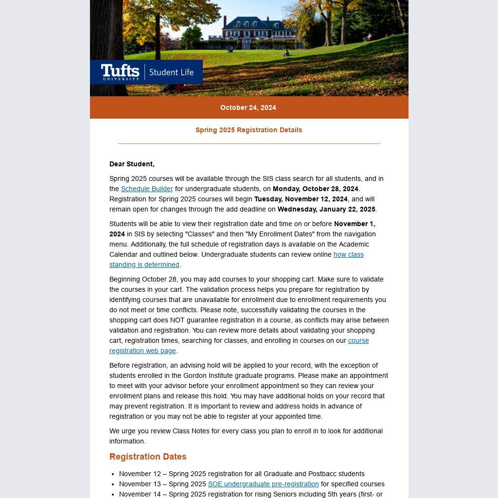 Spring 2025 courses will be available through the SIS class search for all students, and in the Schedule Builder for undergraduate students, on Monday, October 28, 2024. Registration for Spring 2025 courses will begin Tuesday, November 12, 2024, and will remain open for changes through the add deadline on Wednesday, January 22, 2025.