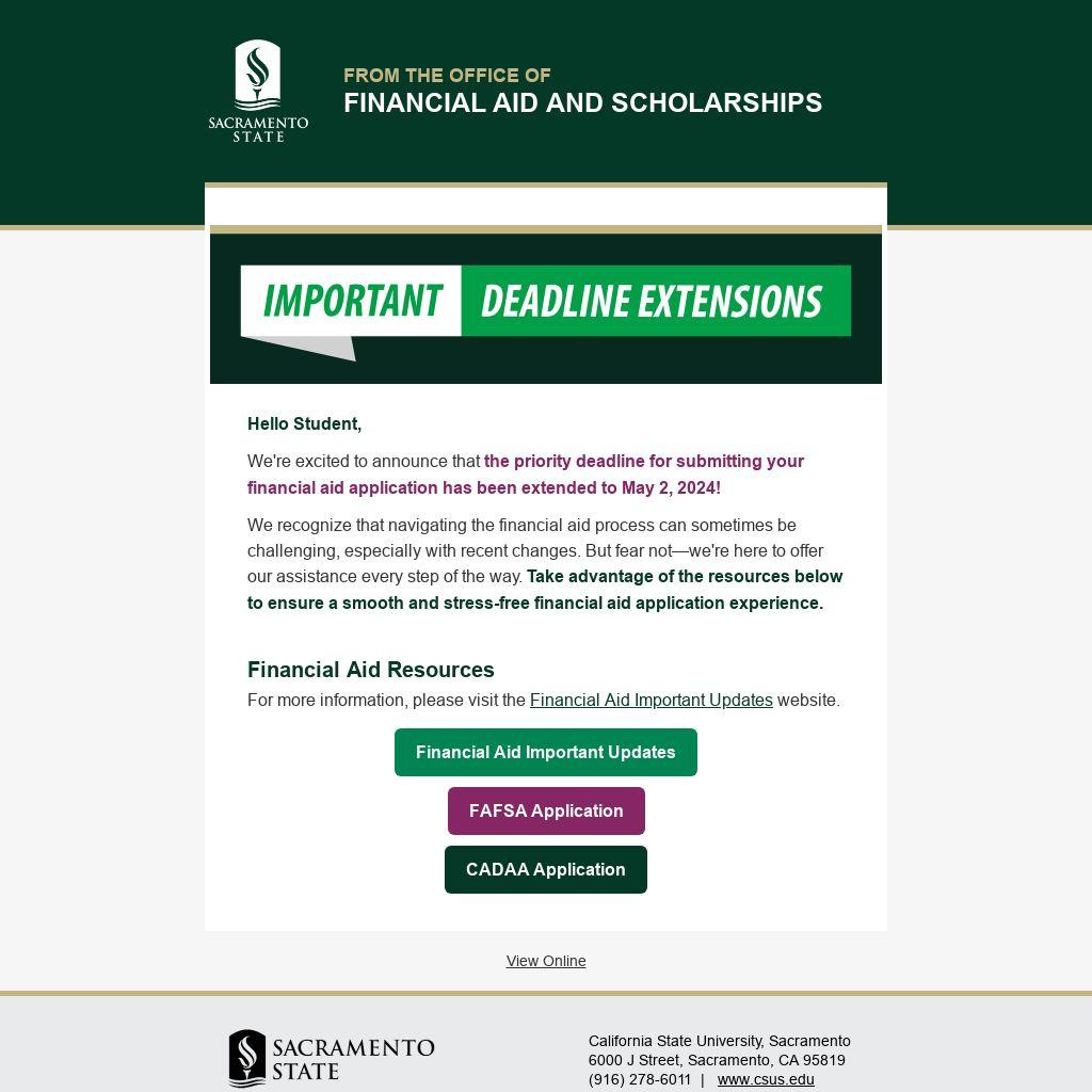 We're excited to announce that the priority deadline for submitting your financial aid application has been extended to May 2, 2024!