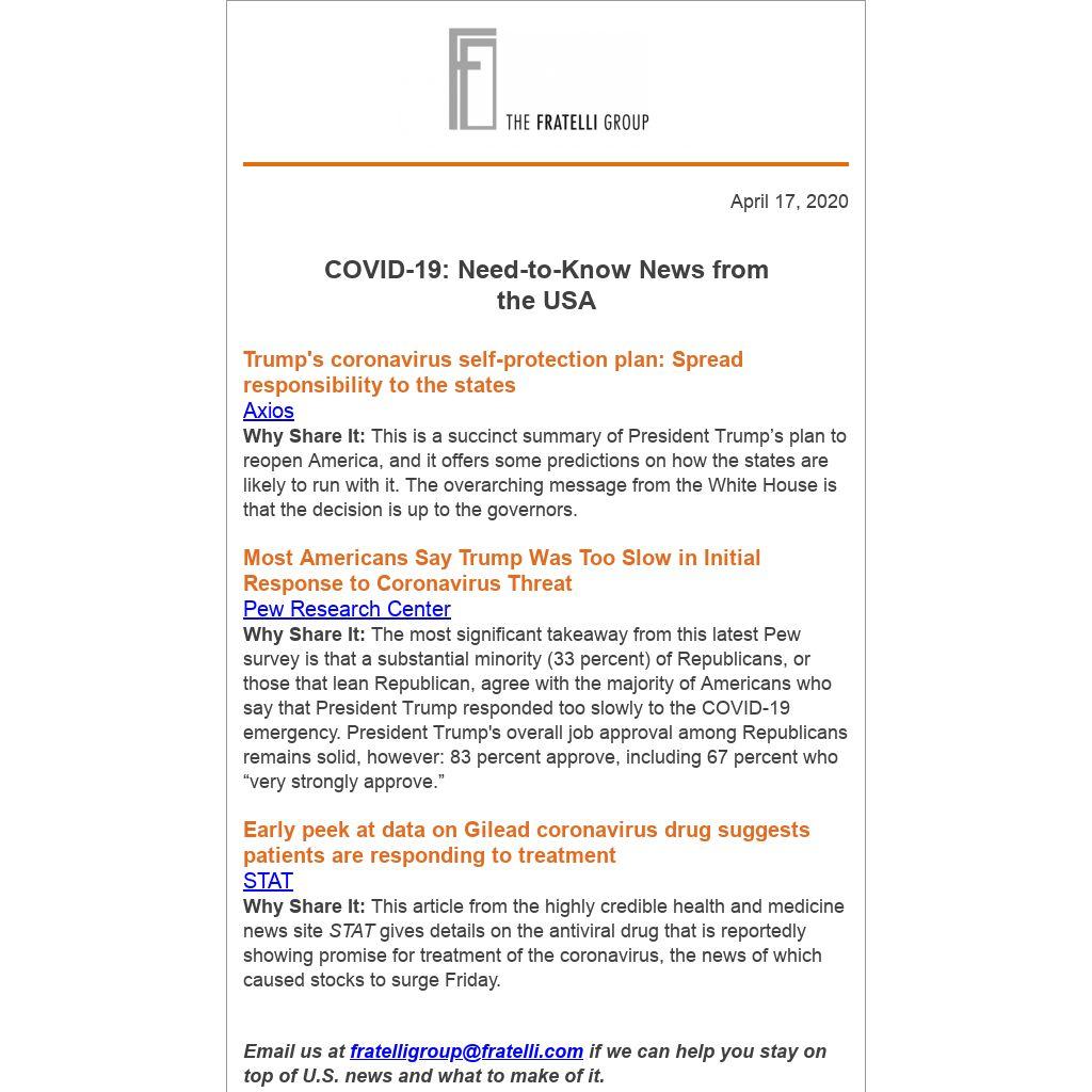 Why Share It: This is a succinct summary of President Trump’s plan to reopen America, and it offers some predictions on how the states are likely to run with it. The overarching message from the White House is that the decision is up to the governors.