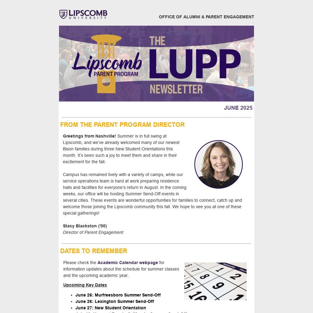 Campus has remained lively with a variety of camps, while our service operations team is hard at work preparing residence halls and facilities for everyone’s return in August. In the coming weeks, our office will be hosting Summer Send-Off events in several cities. These events are wonderful opportunities for families to connect, catch up and welcome those joining the Lipscomb community this fall. We hope to see you at one of these special gatherings!