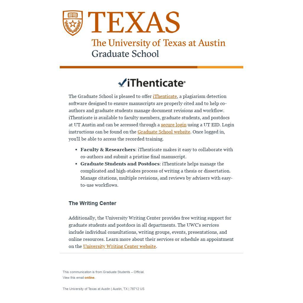 The Graduate School is pleased to offer iThenticate, a plagiarism detection software designed to ensure manuscripts are properly cited and to help co-authors and graduate students manage document revisions and workflow. iThenticate is available to faculty members, graduate students, and postdocs at UT Austin and can be accessed through a secure login using a UT EID. Login instructions can be found on the Graduate School website. Once logged in, you'll be able to access the recorded training.