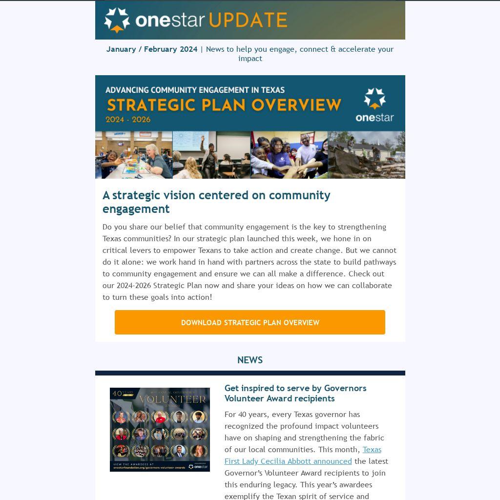Learn about the many vital roles that OneStar fills in advancing service & volunteerism and strengthening the statewide nonprofit sector in our 2023 Annual Report. We are proud of the past year's remarkable achievements that have built a strong foundation for the road ahead. Thank you to our dedicated partners that have supported and served alongside us in this journey!