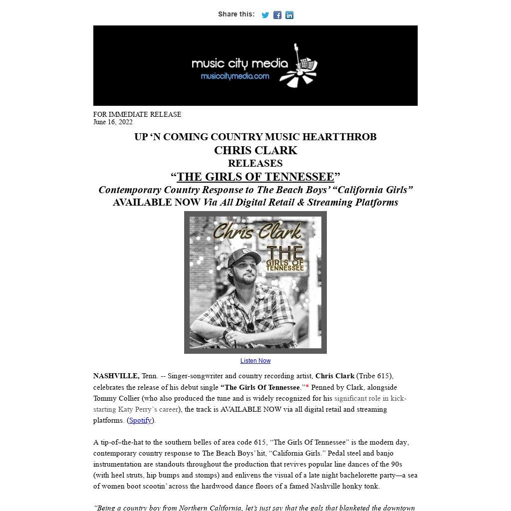 NASHVILLE, Tenn. -- Singer-songwriter and country recording artist, Chris Clark (Tribe 615), celebrates the release of his debut single “The Girls Of Tennessee.”* Penned by Clark, alongside Tommy Collier (who also produced the tune and is widely recognized for his significant role in kick-starting Katy Perry’s career), the track is AVAILABLE NOW via all digital retail and streaming platforms. (Spotify).
