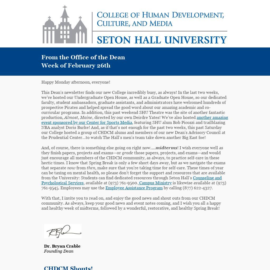 And, of course, there is something else going on right now….midterms! I wish everyone well as they finish papers, projects and exams—or grade those papers, projects, and exams—and would just encourage all members of the CHDCM community, as always, to practice self-care in these hectic times. I know that Spring Break is only a few short days away, but as we navigate the exams that separate now from then, make sure that you’re taking time for self-care. These times of year can be taxing on mental health, so please don’t forget the support and resources that are available from the University: Students can find dedicated resources through Seton Hall’s Counseling and Psychological Services, available at (973) 761-9500. Campus Ministry is likewise available at (973) 761-9545. Employees may use the Employee Assistance Program by calling (877) 622-4327.