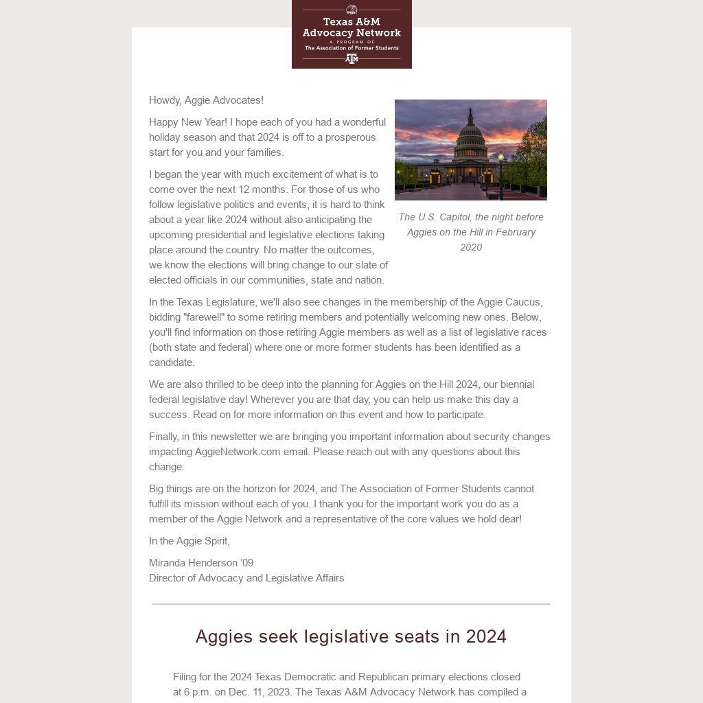 In addition, the Advocacy Network wants to be able to continue to contact you! If you received this newsletter via your @AggieNetwork.com email, please let us know how to continue reaching you with Advocacy news and updates. You can respond to this email, or contact me at MHenderson09@AggieNetwork.com with your updated email address and I will update it for you.