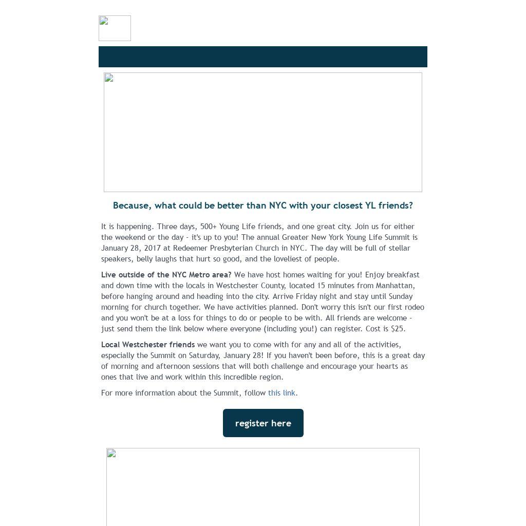 It is happening. Three days, 500+ Young Life friends, and one great city. Join us for either the weekend or the day - it's up to you! The annual Greater New York Young Life Summit is January 28, 2017 at Redeemer Presbyterian Church in NYC. The day will be full of stellar speakers, belly laughs that hurt so good, and the loveliest of people.
