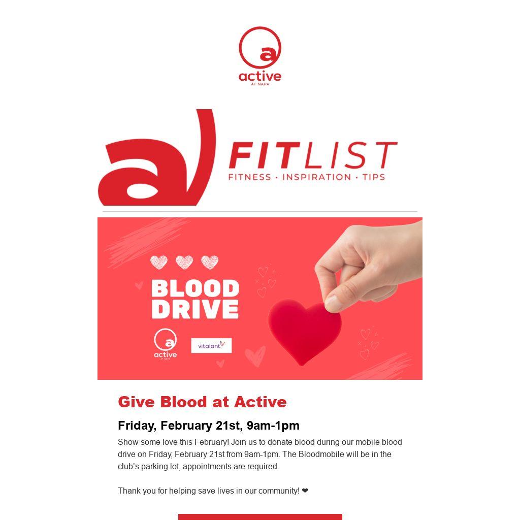 Give Blood at ActiveFriday, February 21st, 9am-1pmShow some love this February! Join us to donate blood during our mobile blood drive on Friday, February 21st from 9am-1pm. The Bloodmobile will be in the club’s parking lot, appointments are required.