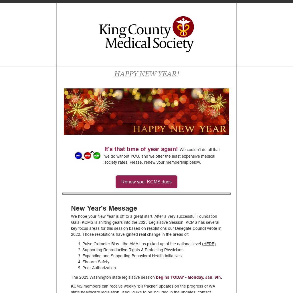 New Year's Message We hope your New Year is off to a great start. After a very successful Foundation Gala, KCMS is shifting gears into the 2023 Legislative Session. KCMS has several key focus areas for this session based on resolutions our Delegate Council wrote in 2022. Those resolutions have ignited real change in the areas of: