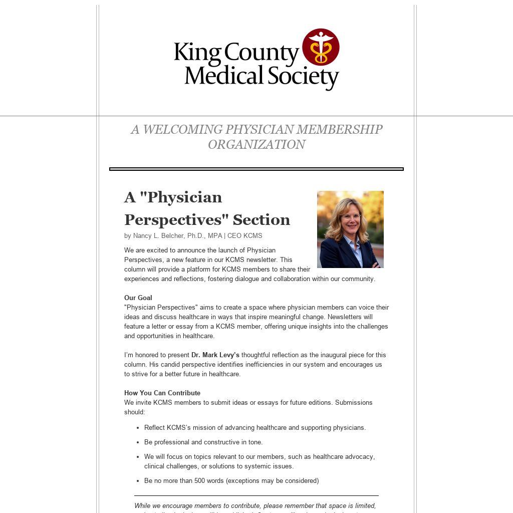 "Physician Perspectives" aims to create a space where physician members can voice their ideas and discuss healthcare in ways that inspire meaningful change. Newsletters will feature a letter or essay from a KCMS member, offering unique insights into the challenges and opportunities in healthcare.