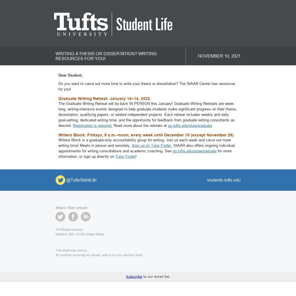 The Graduate Writing Retreat will be back IN PERSON this January! Graduate Writing Retreats are week-long, writing-intensive events designed to help graduate students make significant progress on their thesis, dissertation, qualifying papers, or related independent projects. Each retreat includes weekly and daily goal-setting, dedicated writing time, and the opportunity for feedback from graduate writing consultants as desired. Registration is required. Read more about the retreats at go.tufts.edu/staargraduate.