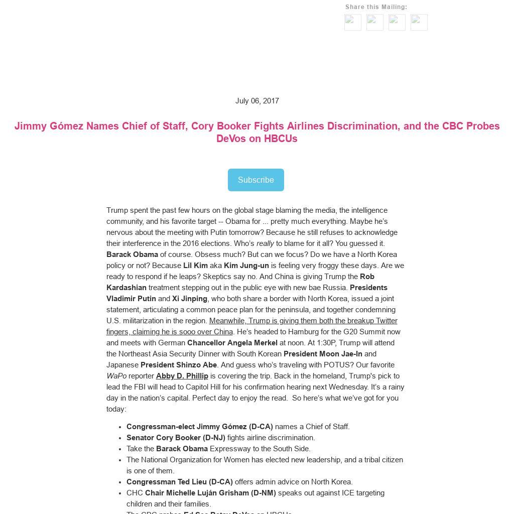Trump spent the past few hours on the global stage blaming the media, the intelligence community, and his favorite target -- Obama for ... pretty much everything. Maybe he’s nervous about the meeting with Putin tomorrow? Because he still refuses to acknowledge their interference in the 2016 elections. Who’s really to blame for it all? You guessed it. Barack Obama of course. Obsess much? But can we focus? Do we have a North Korea policy or not? Because Lil Kim aka Kim Jung-un is feeling very froggy these days. Are we ready to respond if he leaps? Skeptics say no. And China is giving Trump the Rob Kardashian treatment stepping out in the public eye with new bae Russia. Presidents Vladimir Putin and Xi Jinping, who both share a border with North Korea, issued a joint statement, articulating a common peace plan for the peninsula, and together condemning U.S. militarization in the region. Meanwhile, Trump is giving them both the breakup Twitter fingers, claiming he is sooo over China. He’s headed to Hamburg for the G20 Summit now and meets with German Chancellor Angela Merkel at noon. At 1:30P, Trump will attend the Northeast Asia Security Dinner with South Korean President Moon Jae-In and Japanese President Shinzo Abe. And guess who’s traveling with POTUS? Our favorite WaPo reporter Abby D. Phillip is covering the trip. Back in the homeland, Trump's pick to lead the FBI will head to Capitol Hill for his confirmation hearing next Wednesday. It’s a rainy day in the nation’s capital. Perfect day to enjoy the read. So here’s what we’ve got for you today: