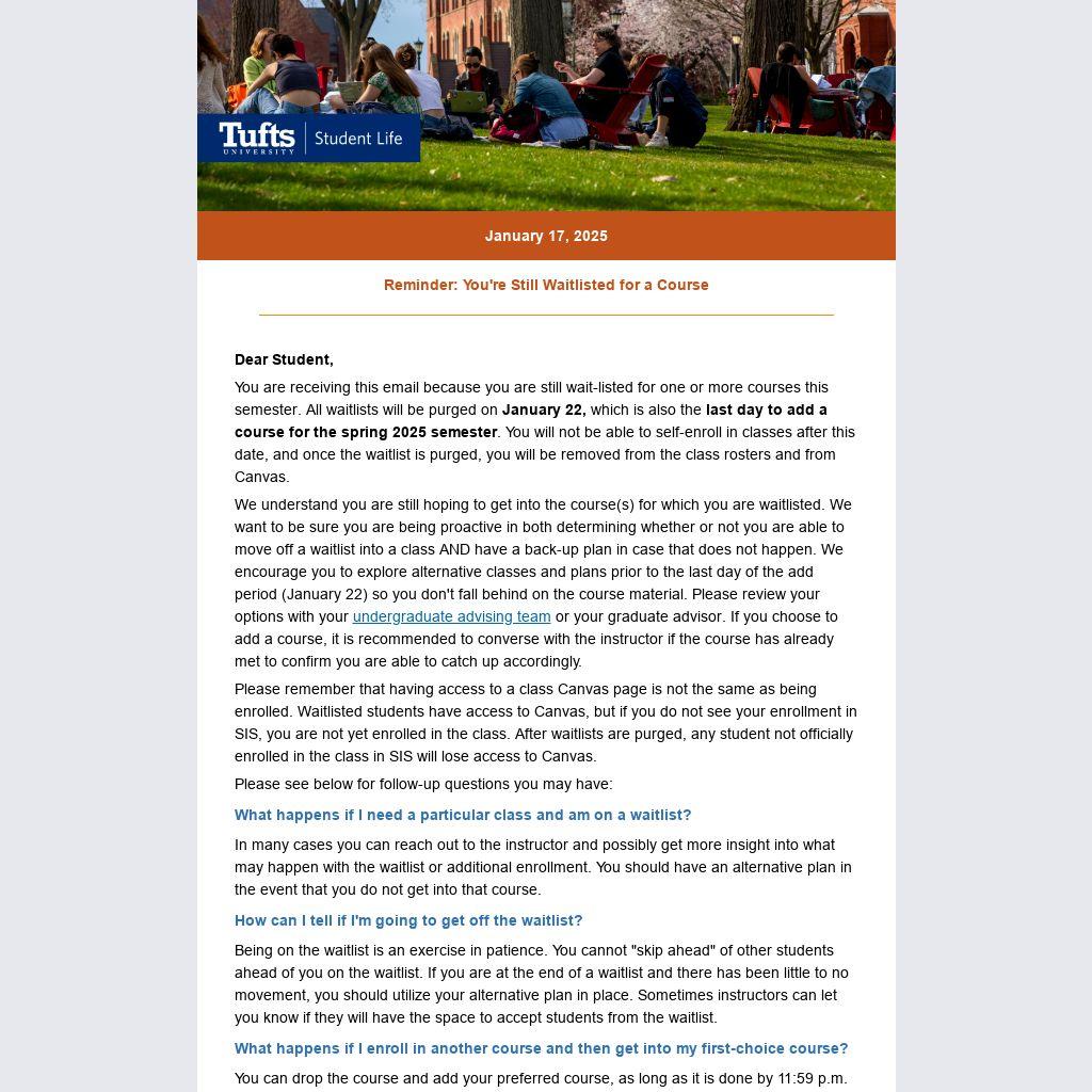 You are receiving this email because you are still wait-listed for one or more courses this semester. All waitlists will be purged on January 22, which is also the last day to add a course for the spring 2025 semester. You will not be able to self-enroll in classes after this date, and once the waitlist is purged, you will be removed from the class rosters and from Canvas.