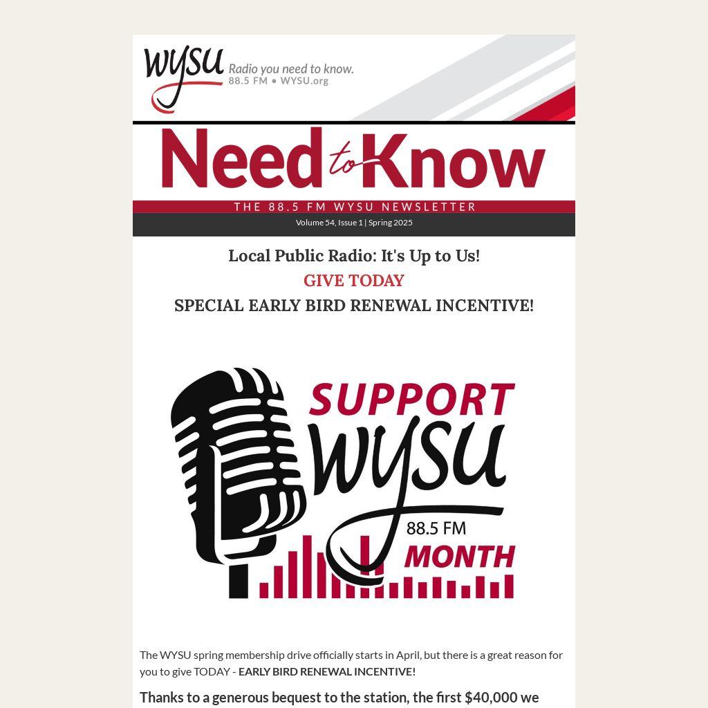 The WYSU spring membership drive officially starts in April, but there is a great reason for you to give TODAY - EARLY BIRD RENEWAL INCENTIVE!