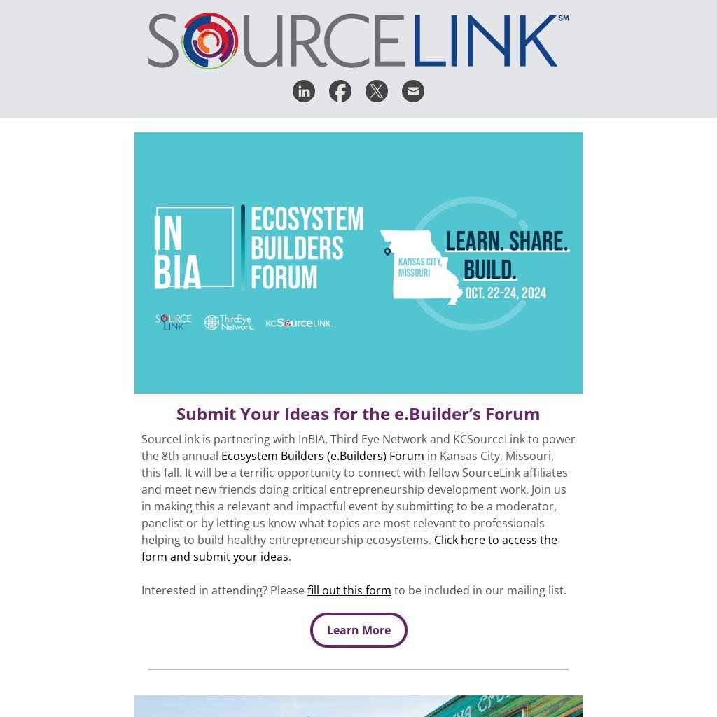 SourceLink is partnering with InBIA, Third Eye Network and KCSourceLink to power the 8th annual Ecosystem Builders (e.Builders) Forum in Kansas City, Missouri, this fall. It will be a terrific opportunity to connect with fellow SourceLink affiliates and meet new friends doing critical entrepreneurship development work. Join us in making this a relevant and impactful event by submitting to be a moderator, panelist or by letting us know what topics are most relevant to professionals helping to build healthy entrepreneurship ecosystems. Click here to access the form and submit your ideas.
