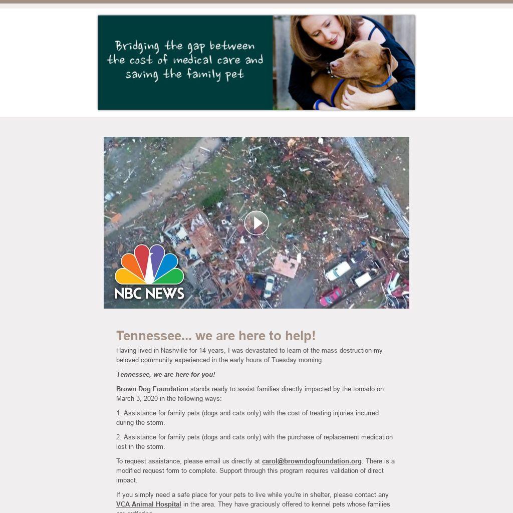 Brown Dog Foundation stands ready to assist families directly impacted by the tornado on March 3, 2020 in the following ways: