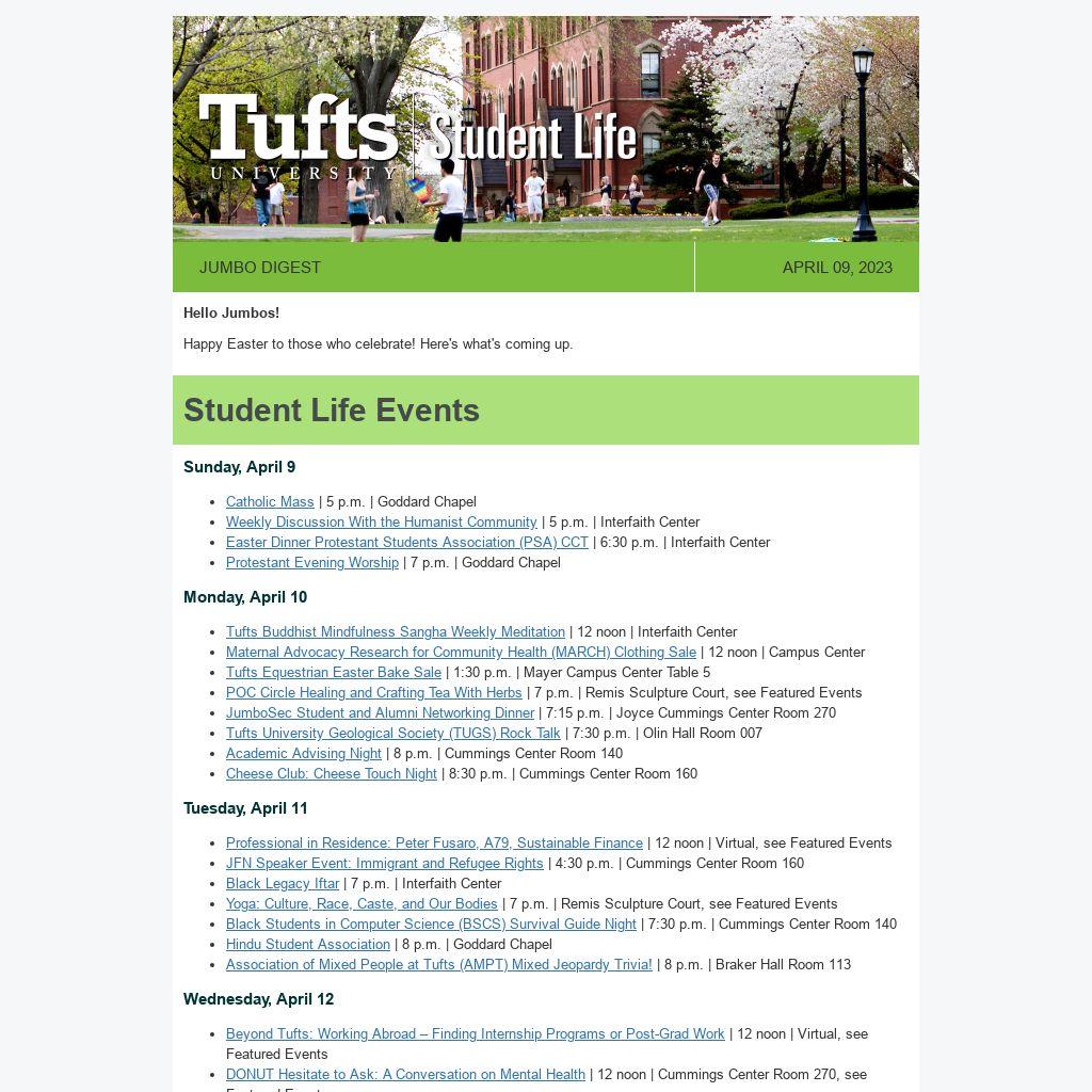 Students and Student Organizations can submit events to JumboLife! Add your event by Thursday at 12 noon each week, and we'll include it in the Jumbo Digest on Sunday.