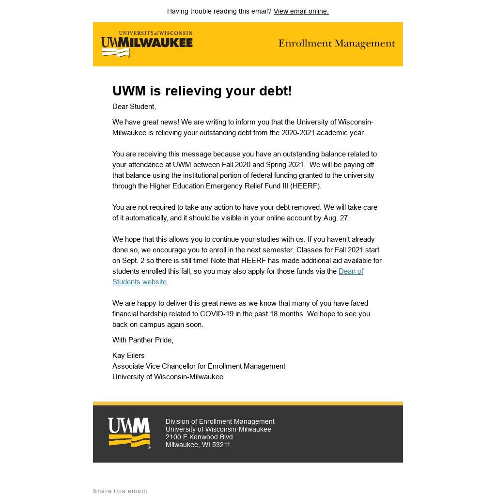 We have great news! We are writing to inform you that the University of Wisconsin-Milwaukee is relieving your outstanding debt from the 2020-2021 academic year.