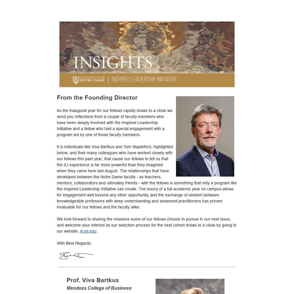 It is individuals like Viva Bartkus and Tom Stapleford, highlighted below, and their many colleagues who have worked closely with our fellows this past year, that cause our fellows to tell us that the ILI experience is far more powerful than they imagined when they came here last August. The relationships that have developed between the Notre Dame faculty - as teachers, mentors, collaborators and ultimately friends - with the fellows is something that only a program like the Inspired Leadership Initiative can create. The luxury of a full academic year on campus allows for engagement well beyond any other opportunity, and the exchange of wisdom between knowledgeable professors with deep understanding and seasoned practitioners has proven invaluable for our fellows and the faculty alike.