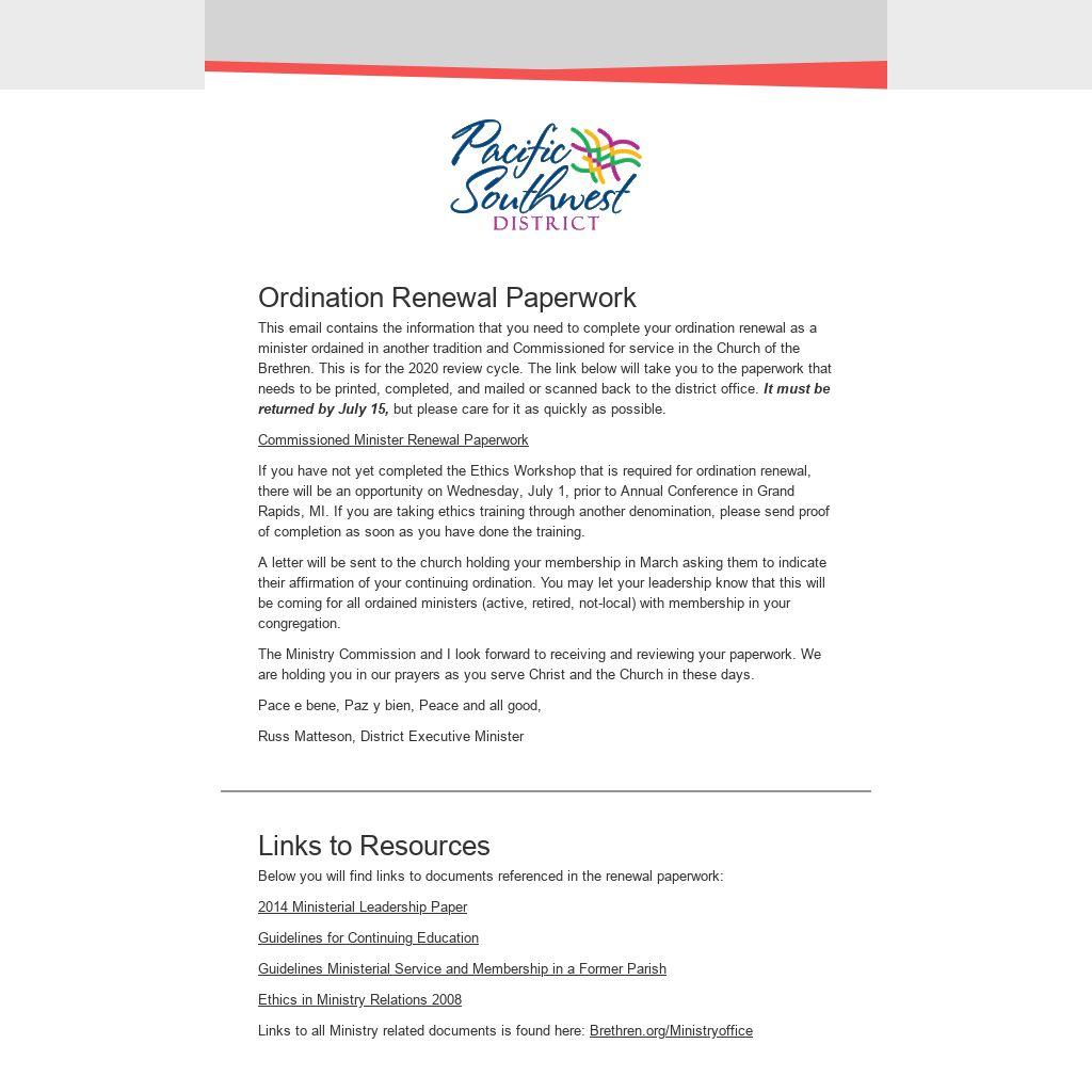 This email contains the information that you need to complete your ordination renewal as a minister ordained in another tradition and Commissioned for service in the Church of the Brethren. This is for the 2020 review cycle. The link below will take you to the paperwork that needs to be printed, completed, and mailed or scanned back to the district office. It must be returned by July 15, but please care for it as quickly as possible.