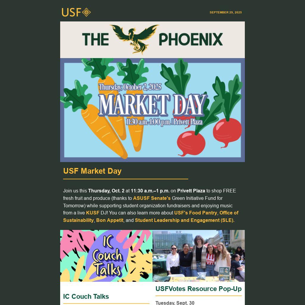 The Phoenix is a weekly e-newsletter sent by Student Leadership and Engagement to help students stay connected and get involved. It features campus events, leadership opportunities, athletic games, workshops, retreats, and more. Why “The Phoenix” title? The Phoenix has long been associated with the history and growth of USF as well as St. Ignatius, who encouraged followers to “go forth and set the world on fire.” Learn more »