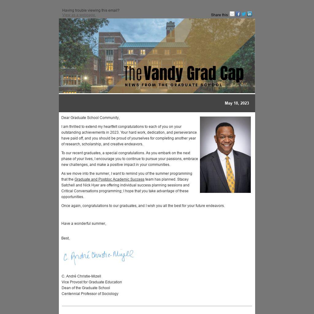 Newsletter SubmissionsTo submit content for this newsletter or to subscribe, please email all relevant information to gradschoolnews@vanderbilt.edu by the 10th day of each month. The newsletter will be published around middle of each month.