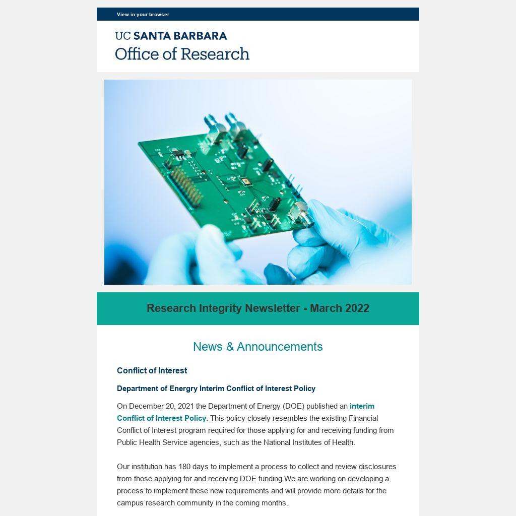 The IACUC keeps all vertebrate animal users apprised of changes to our program by sending out newsletters with important updates, including revisions to our IACUC Guidelines and Procedures documents. Newsletters are usually sent twice a year from iacucnews@lifesci.ucsb.edu. All issues of the IACUC Newsletter can be accessed from the Office of Research website.