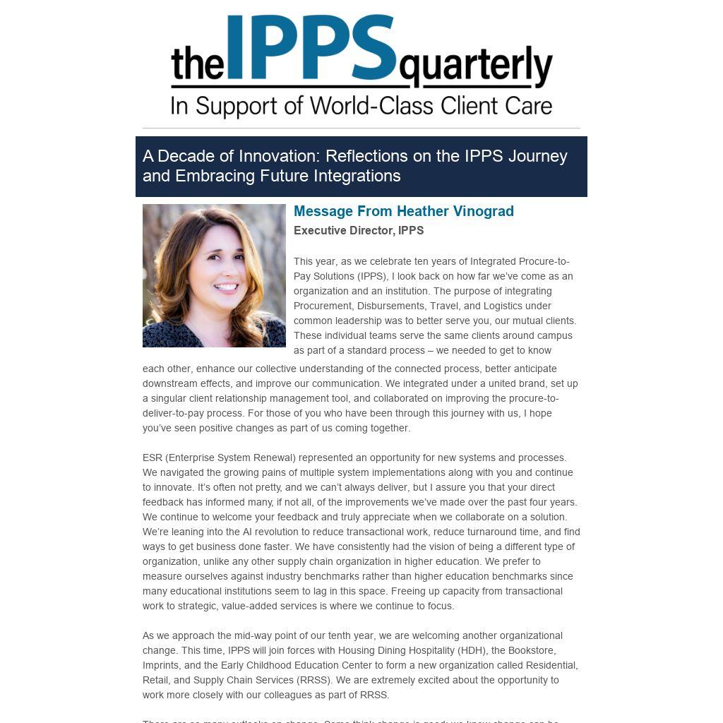 This year, as we celebrate ten years of Integrated Procure-to-Pay Solutions (IPPS), I look back on how far we’ve come as an organization and an institution. The purpose of integrating Procurement, Disbursements, Travel, and Logistics under common leadership was to better serve you, our mutual clients. These individual teams serve the same clients around campus as part of a standard process – we needed to get to know