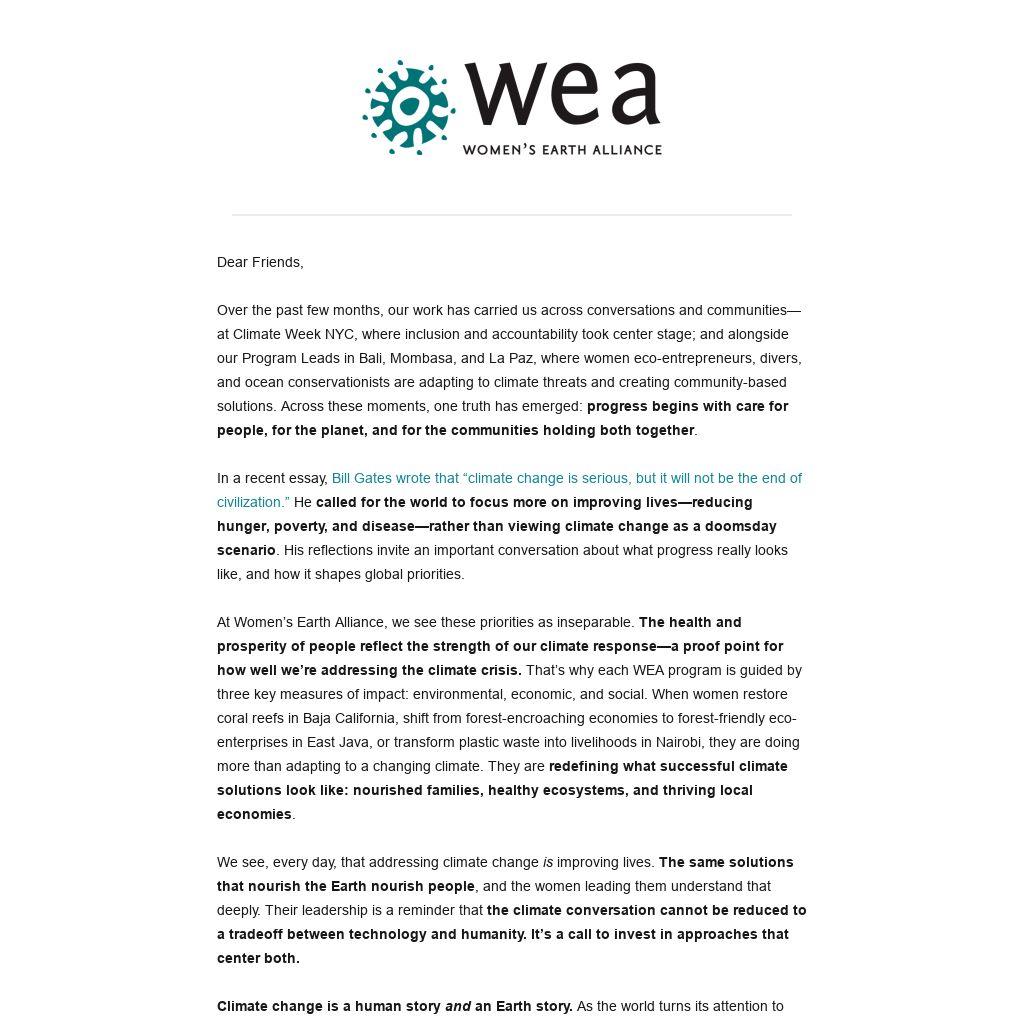Women's Earth Alliance (WEA) empowers women’s leadership to protect our environment, end the climate crisis, and ensure a just, thriving world.