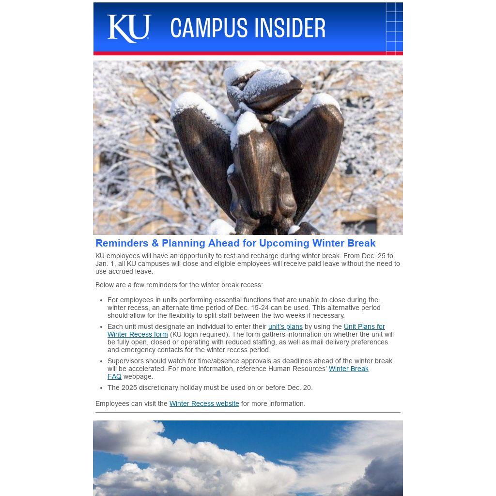 KU employees will have an opportunity to rest and recharge during winter break. From Dec. 25 to Jan. 1, all KU campuses will close and eligible employees will receive paid leave without the need to use accrued leave.