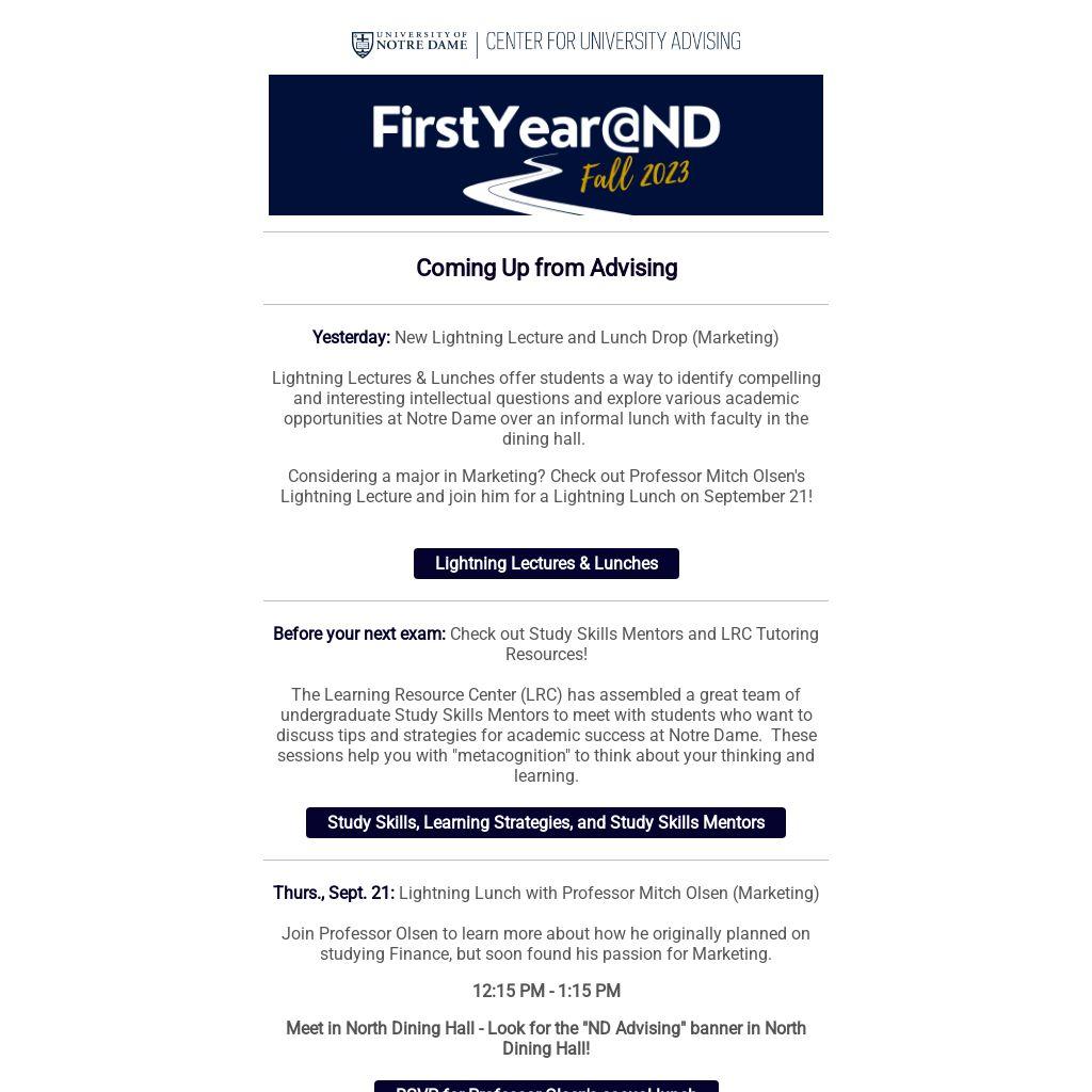 Have lunch with Professor Olsen in NDH on Thursday, September 21, 2023 at 12. This lunch is an opportunity for first-years to explore Marketing and the Mendoza College of Business ☘️