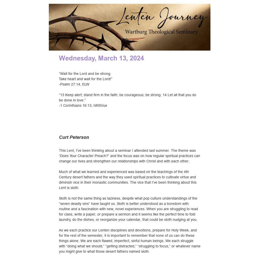 As we each practice our Lenten disciplines and devotions, prepare for Holy Week, and for the rest of the semester, it is important to remember that none of us can do these things alone. We are each flawed, imperfect, sinful human beings. We each struggle with “doing what we should,” “getting distracted,” “struggling to focus,” or whatever name you might give to what those desert fathers named sloth.