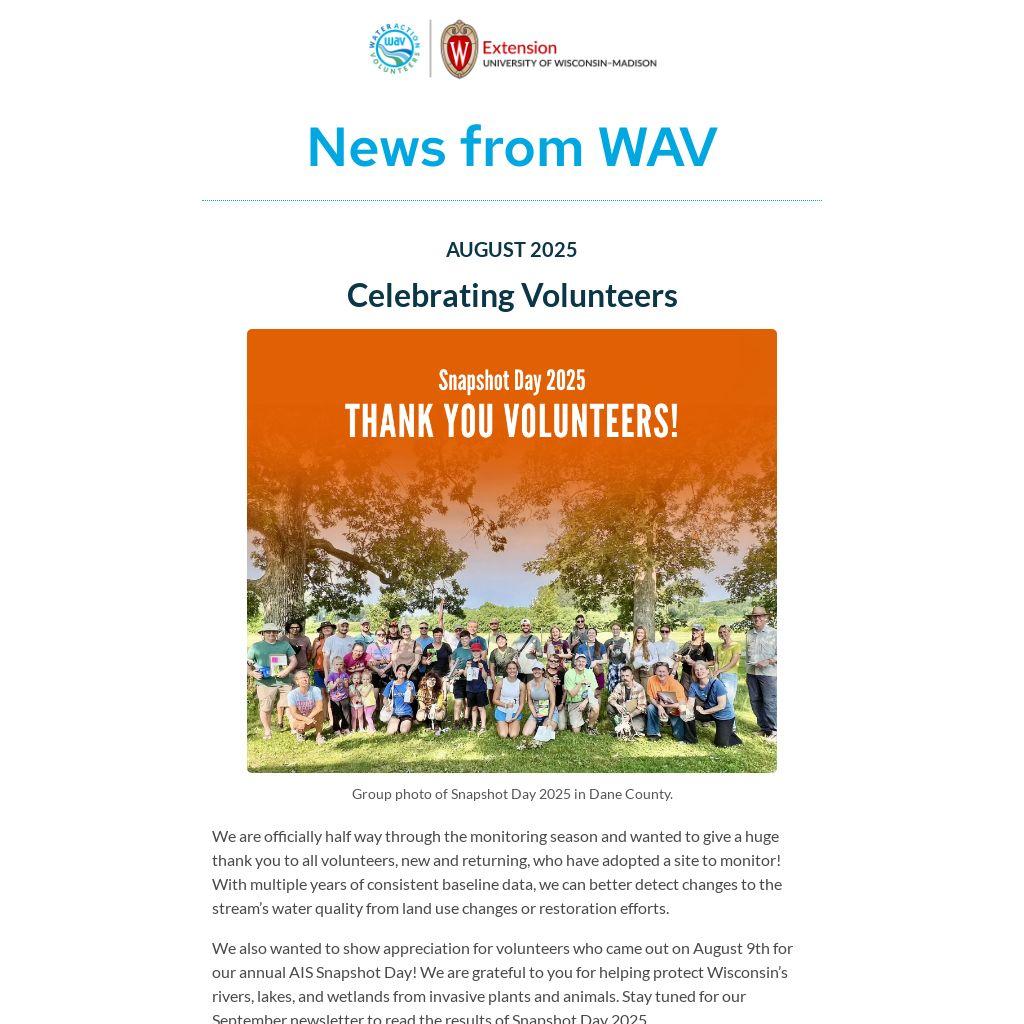 We also wanted to show appreciation for volunteers who came out on August 9th for our annual AIS Snapshot Day! We are grateful to you for helping protect Wisconsin’s rivers, lakes, and wetlands from invasive plants and animals. Stay tuned for our September newsletter to read the results of Snapshot Day 2025.