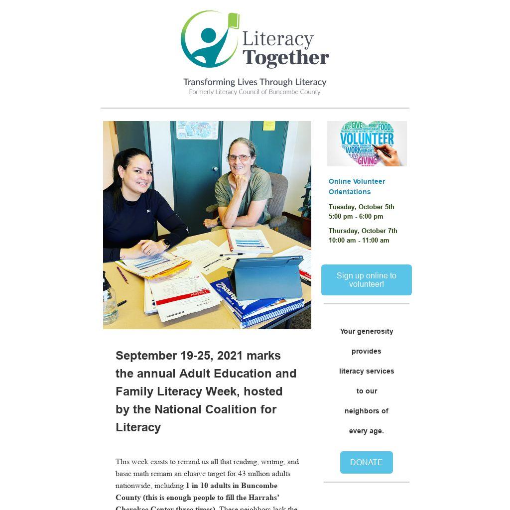 She has been a volunteer with Literacy Together for the last four years. "Volunteering to help adults learn English is gratifying because I get to see the naturalization process a bit more through the eyes of the student. I admire our students so much because of their dedication to achieving their own goals, which is often part of a larger commitment to family, friends, and community."