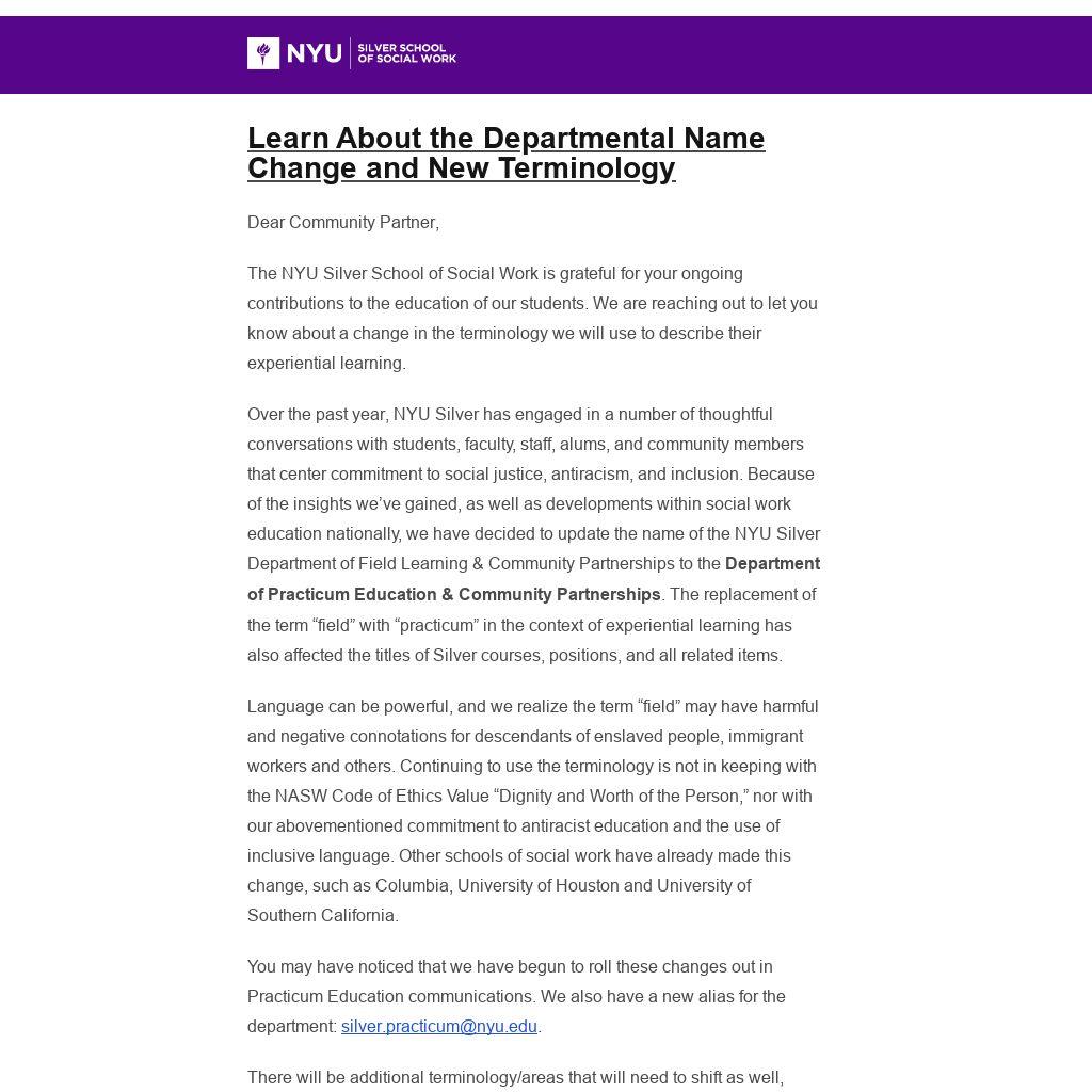The NYU Silver School of Social Work is grateful for your ongoing contributions to the education of our students. We are reaching out to let you know about a change in the terminology we will use to describe their experiential learning.