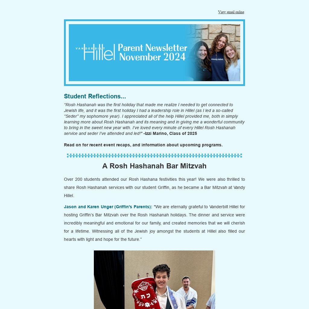 Jason and Karen Unger (Griffin's Parents): "We are eternally grateful to Vanderbilt Hillel for hosting Griffin’s Bar Mitzvah over the Rosh Hashanah holidays. The dinner and service were incredibly meaningful and emotional for our family, and created memories that we will cherish for a lifetime. Witnessing all of the Jewish joy amongst the students at Hillel also filled our hearts with light and hope for the future.”