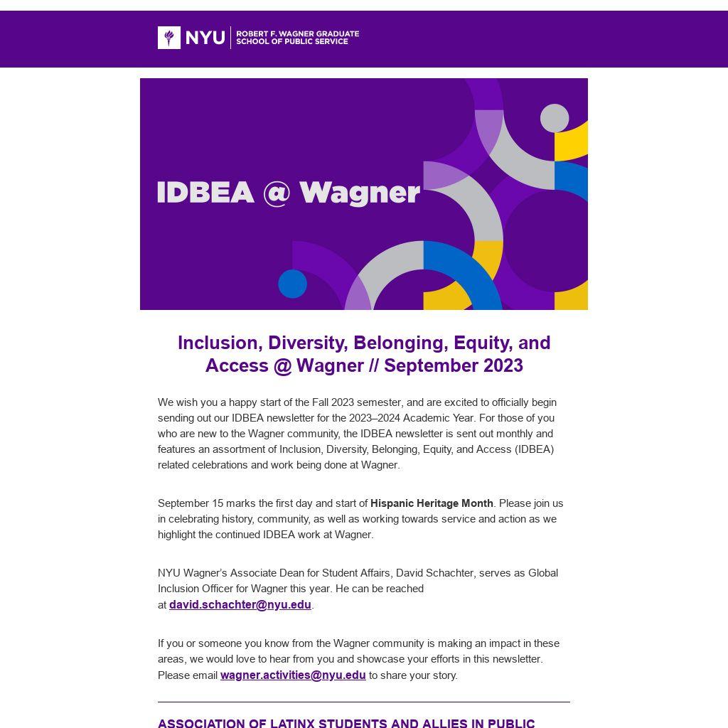 We wish you a happy start of the Fall 2023 semester, and are excited to officially begin sending out our IDBEA newsletter for the 2023–2024 Academic Year. For those of you who are new to the Wagner community, the IDBEA newsletter is sent out monthly and features an assortment of Inclusion, Diversity, Belonging, Equity, and Access (IDBEA) related celebrations and work being done at Wagner.