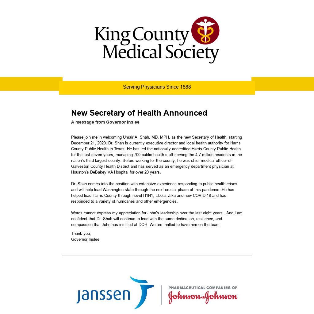 Please join me in welcoming Umair A. Shah, MD, MPH, as the new Secretary of Health, starting December 21, 2020. Dr. Shah is currently executive director and local health authority for Harris County Public Health in Texas. He has led the nationally accredited Harris County Public Health for the last seven years, managing 700 public health staff serving the 4.7 million residents in the nation’s third largest county. Before working for the county, he was chief medical officer of Galveston County Health District and has served as an emergency department physician at Houston’s DeBakey VA Hospital for over 20 years.