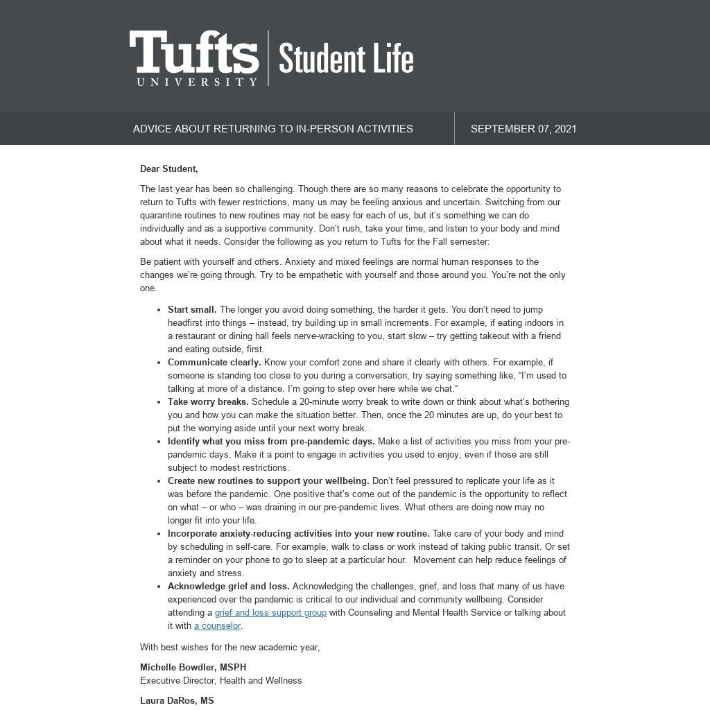 The last year has been so challenging. Though there are so many reasons to celebrate the opportunity to return to Tufts with fewer restrictions, many us may be feeling anxious and uncertain. Switching from our quarantine routines to new routines may not be easy for each of us, but it’s something we can do individually and as a supportive community. Don’t rush, take your time, and listen to your body and mind about what it needs. Consider the following as you return to Tufts for the Fall semester: