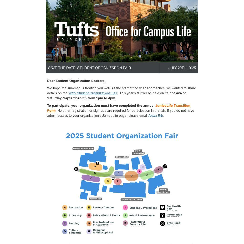 - Schedule and reserve your GIM or other meetings on ReserveTufts in advance to be able to promote these dates to students during the fair. ReserveTufts will open for student organizations after 10am on August 25th. In order to log in to ReserveTufts when the system opens to student organizations, please ensure you have completed your JumboLife Transition Form to update your organization's ReserveTufts contact by the August 15th deadline.
